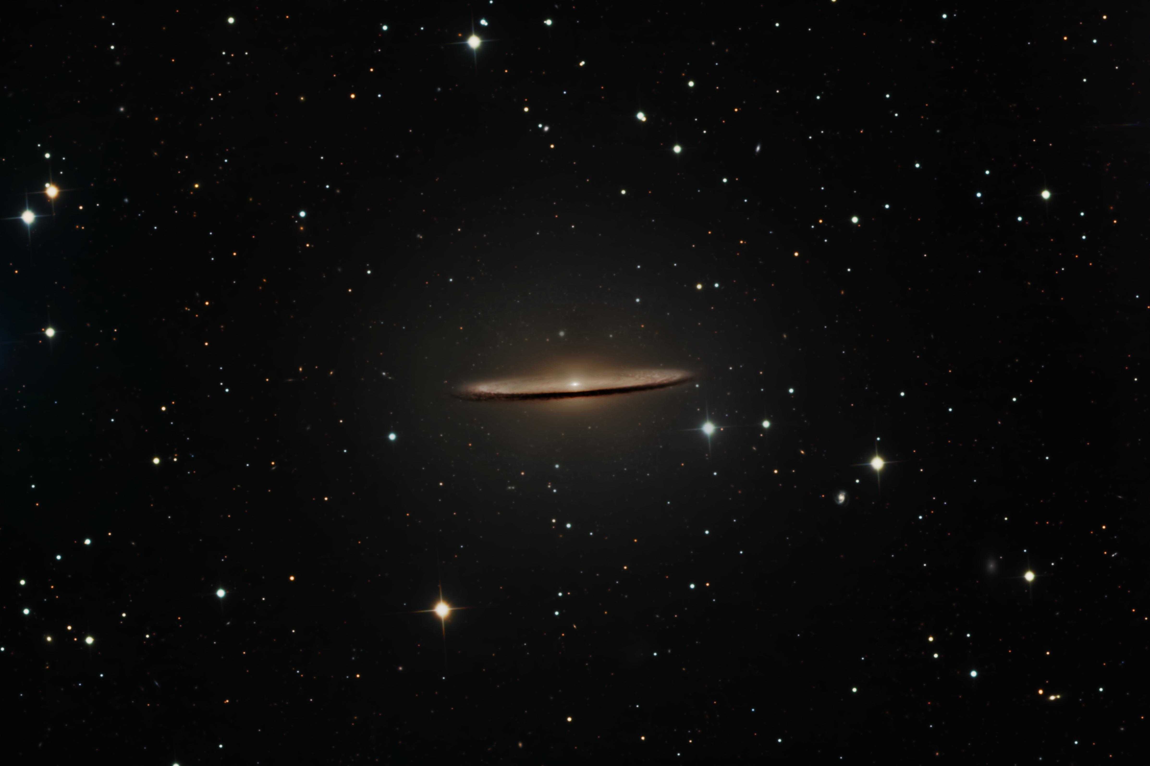 - The Sombrero Galaxy Sitting as a member of the Virgo !! Groups - a string of galaxies and globular clusters near the Virgo Supercluster, the Sombrero Galaxy is about 31.1 million light-years away from us and has a diameter of about 105,000 light-years, making it slightly larger than our Milky Way. It is currently classified as a peculiar galaxy, but no other information about it's classification is known since we can't see into the interior to see if it has a bar (or two), or even if it is a spiral galaxy. It has a very well defined dust lane along its outer edge as well as some interior dust lanes. Image processed by Ron Yelton, original data from Telescope Live |