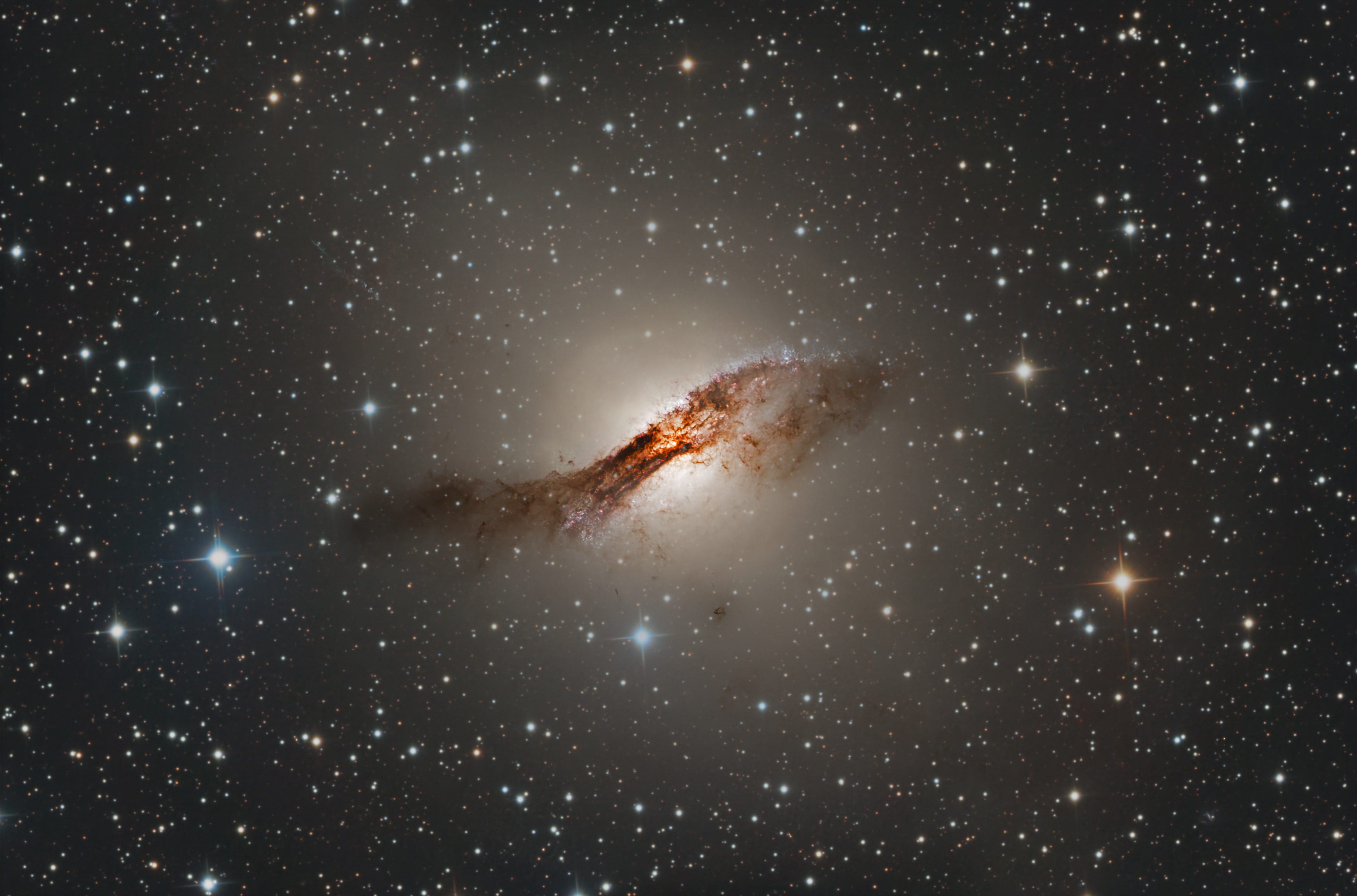 Centaurus A This galaxy is found in the southern hemisphere and sits around 12 million light-years away in the constellation Centaurus (The Centaur). It is the fifth brightest galaxy in our nighttime sky as well as the closest radio galaxy to Earth. It also has a very active galactic nucleus. There isn't complete agreement as to whether this is a lenticular galaxy or a giant eliptical galaxy. At its center is a supermassive black hole that weighs in at around 55 million solar masses. There are two relativistic jets being ejected perpendicular to the brown dust lanes that are heavy in x-ray and radio frequencies. It is thought that a collision between this galaxy (eliptical) and a smaller spiral galaxy has caused massive amounts of new star formation. Image processed by Ron Yelton, original data from Telescope Live |