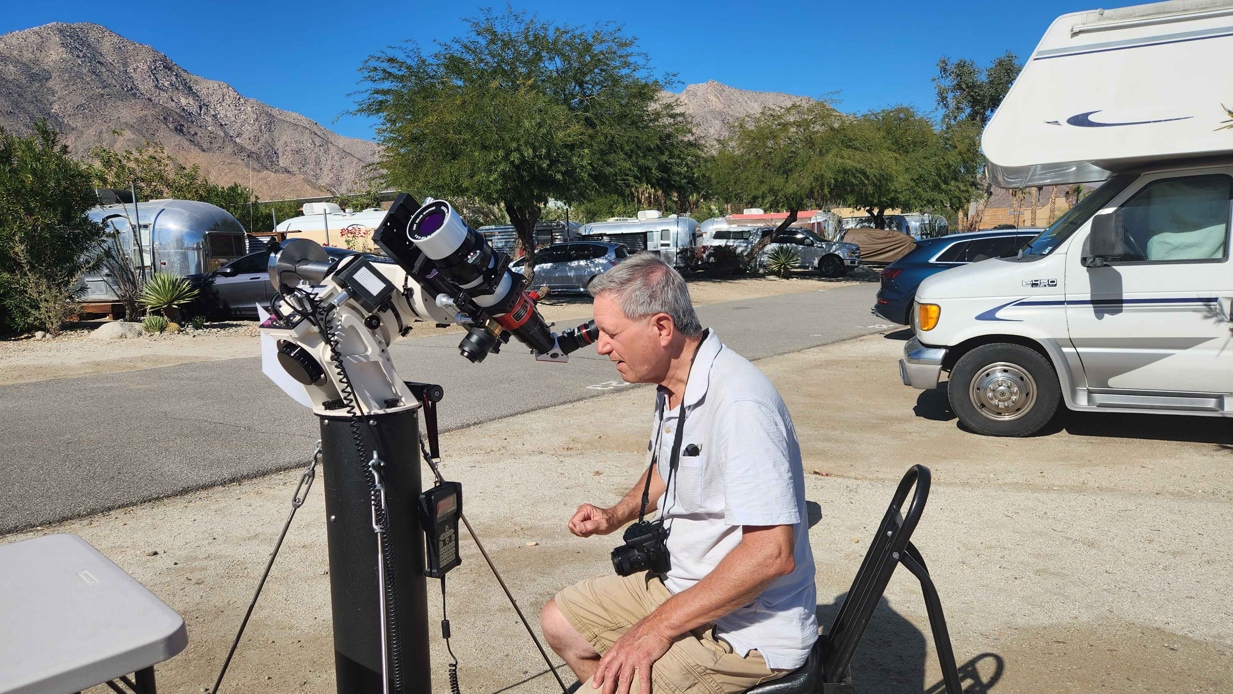 2023 Terry, checking out the Sun. Had the solar scope out during the day for any and all to take a look. Put the 9.25" scope on at night to work on the Herschel 400 and a list of Carbon stars that Jeff found for me. |